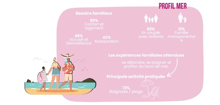 Cette étude montre les transformations des attentes et des pratiques des familles françaises en matière de vacances, en détaillant plusieurs profils de familles en vacances, que ce soit à la mer, la montagne, la nature ou la ville.