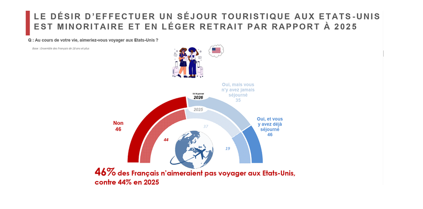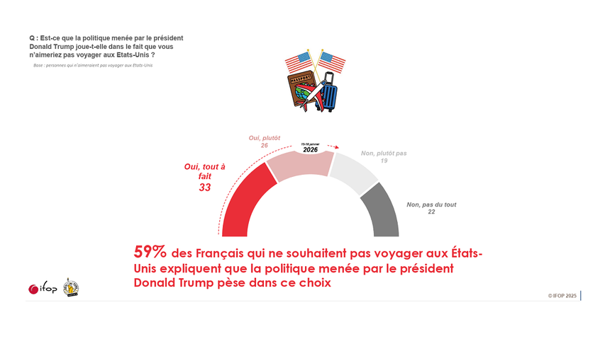 Près d’un Français sur deux (46 %) déclare ne pas souhaiter voyager aux États-Unis. Parmi eux, 59 % invoquent la politique menée par Donald Trump comme facteur déterminant dans leur décision.