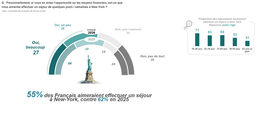 Étude Ifop pour Partir à New York réalisée par questionnaire auto-administré en ligne en janvier 2026 auprès d’un échantillon de 1 000 personnes représentatif de la population française âgée de 18 ans et plus.