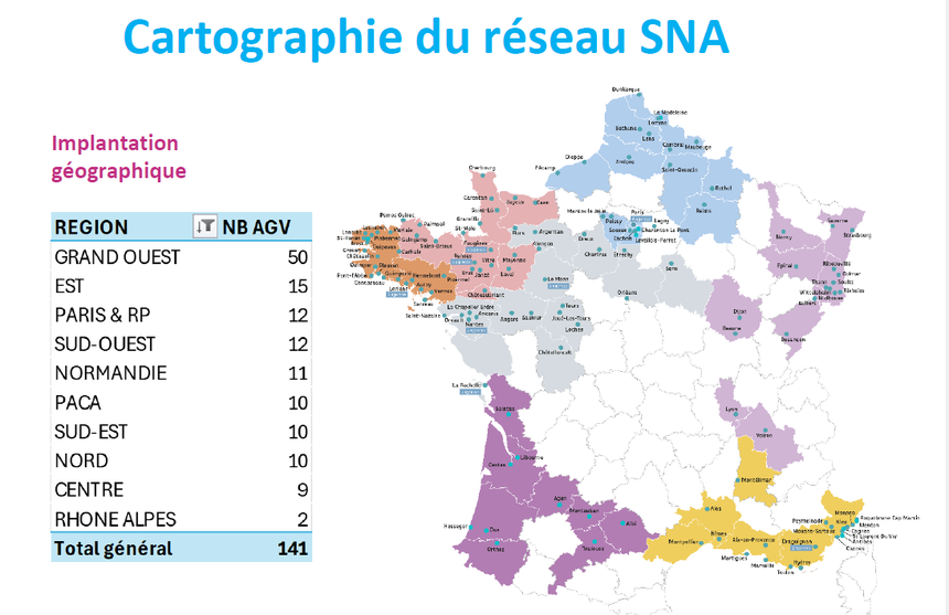 Avec 141 agences en France, auxquelles s’ajoutent 12 agences en Belgique, le réseau couvre aujourd’hui l’ensemble du territoire national. Le Grand Ouest demeure le bassin historique et le premier pôle d’implantation, avec 50 agences, principalement en Bretagne et dans les Pays de la Loire. Le Finistère concentre à lui seul 14 points de vente, soit près d’un tiers du réseau régional.
