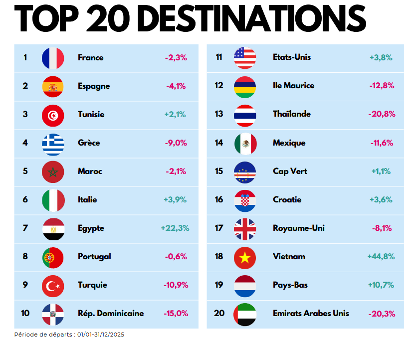 Le Top 20 des destinations illustre cette recomposition : la France reste en tête mais en léger recul, tandis que plusieurs destinations moyen-courrier gagnent du terrain, comme l’Égypte ou l’Italie. Côté long-courrier, le Vietnam se distingue par une forte progression, alors que d’autres destinations lointaines (Thaïlande, Émirats arabes unis, République Dominicaine, Île Maurice) restent en retrait.