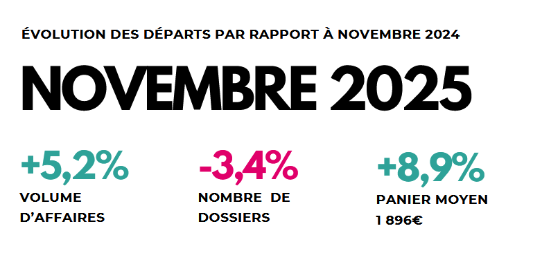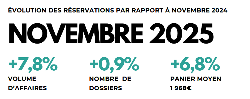 Les réservations du mois de novembre 2025 se situent à un niveau très proche de celui de novembre 2024, avec un nombre de voyages légèrement en hausse mais une augmentation marquée du budget moyen par dossier, qui progresse de près de 7 %.