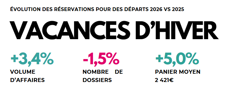 Pour les vacances d’hiver 2026, le nombre de voyageurs s’annonce pour le moment en léger recul par rapport à 2025, mais l’activité progresse grâce à une hausse du budget moyen par séjour. Le moyen-courrier tire la saison avec une augmentation sensible des départs, suivi par un long-courrier également en amélioration. La France est en retrait. Les circuits et certaines destinations à l’étranger progressent, tandis que les familles sont un peu moins nombreuses que les duos et les voyageurs solos.