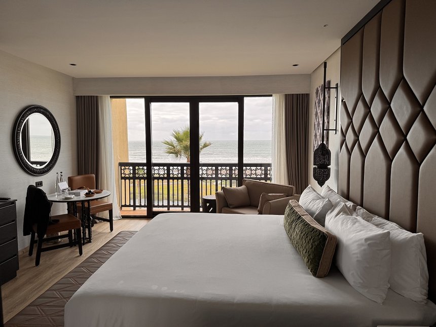 Au cœur des jardins et miroirs d’eau, 500 chambres et suites (492 plus précisément, sur 4 étages) s’ouvrent toutes sur la piscine, le jardin, le golf, la forêt ou la mer. Toutes les chambres disposent d’une vue ouverte et dégagée. Il ne vous reste plus qu’à choisir laquelle. 80 % des chambres sont communicantes, un vrai plus pour les séjours en famille. Décor arabo-mauresque chaleureux, lit king size et grands volumes complètent l’expérience.