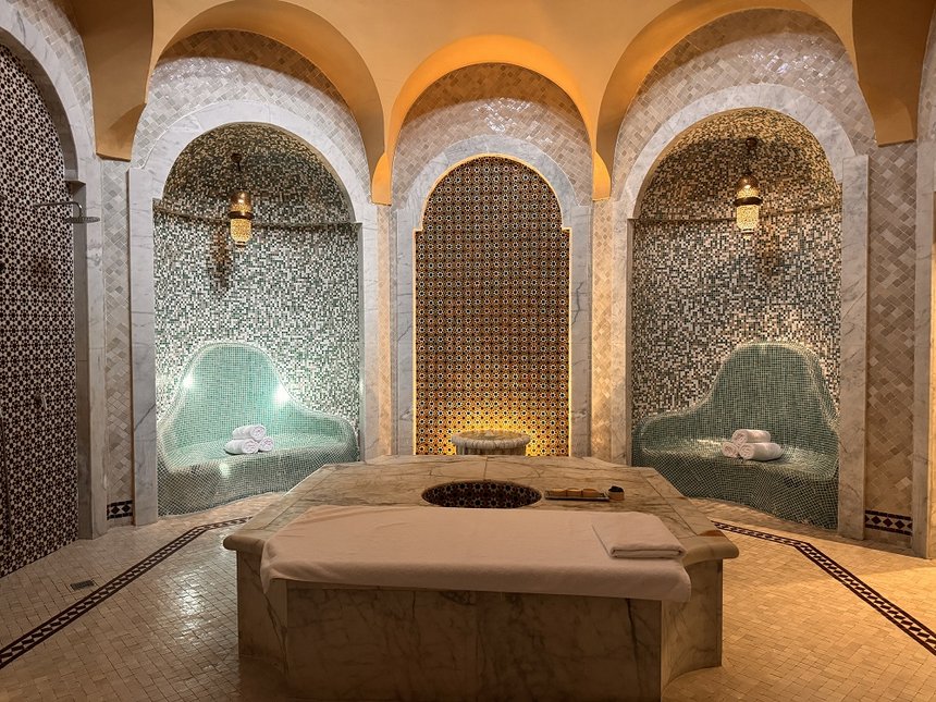 Le hammam traditionnel, vaste et lumineux, est un passage obligé : enveloppement au savon noir, gommage au gant kessa, rinçage à l’eau tiède et massage à l’huile d’argan sur table de marbre chaude.