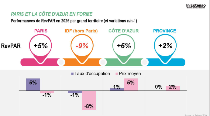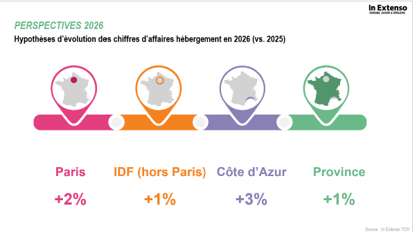 En Régions, où l’offre reste majoritairement orientée vers la clientèle d’affaires, 2026 s’annonce encore mitigée. Un gain modéré de 1% du RevPAR est ainsi anticipé.