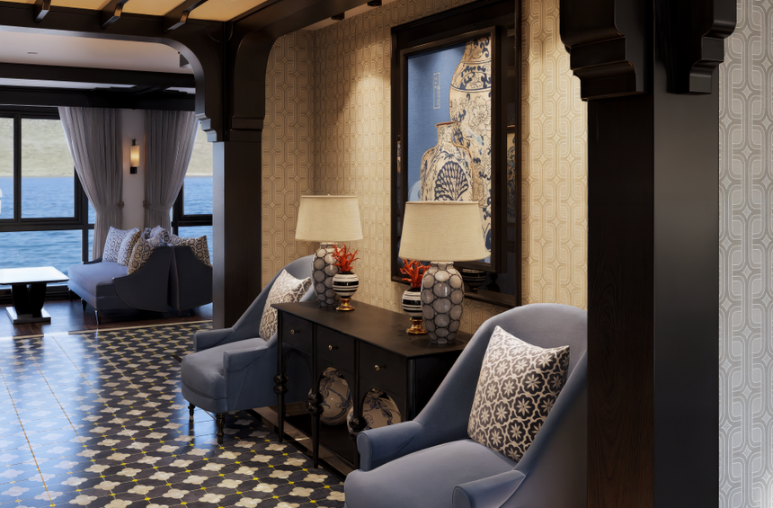 Espace et élégance : les cabines disposent toutes d’un espace extérieur ; elles allient confort moderne et raffinement asiatique. Des Cabines Deluxe (30 m²) aux somptueuses Suites Armateur (60 m² avec terrasse privée), chaque chambre est un véritable havre de paix sur l’eau.