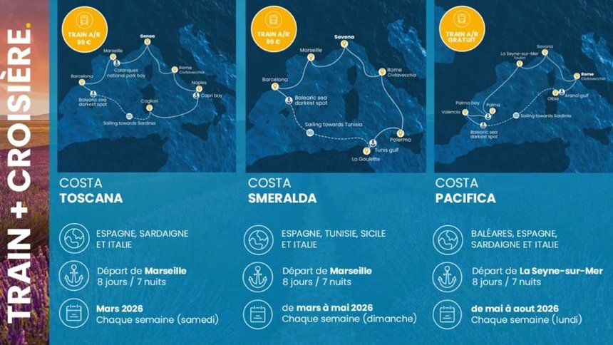 Jusqu’au 28 février 2026 et pour tous les départs jusqu’à juin 2026, Costa facilite l’accès aux ports de vos clients avec une offre spéciale : seulement 99 € par personne pour un billet de train aller-retour depuis Paris, Lyon, Nice, Aix-en-Provence, Avignon, Béziers, Montpellier, Nîmes, Bordeaux, Nantes, Lille, Valence, Strasbourg et Rennes. Cette promotion est valable pour embarquer sur le Costa Smeralda (le samedi) et le Costa Toscana (le dimanche), au départ de Marseille.